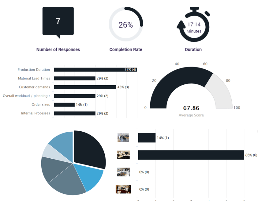 About half way through the day we ran another poll with the leadership team, there were 30 of them. Now we could have run a show of hands or got people to stand in corners etc or write on post its, and we do all of those things as well but we tried something new. We launched another poll in Survey Anyplace that the guys filled in over their lunch break, this one wasn't linked to anything just a straight survey. What about the results, the analysis the charts!?, well the great thing is that the system will actually draw charts for you real time, an example of those are shown to the left