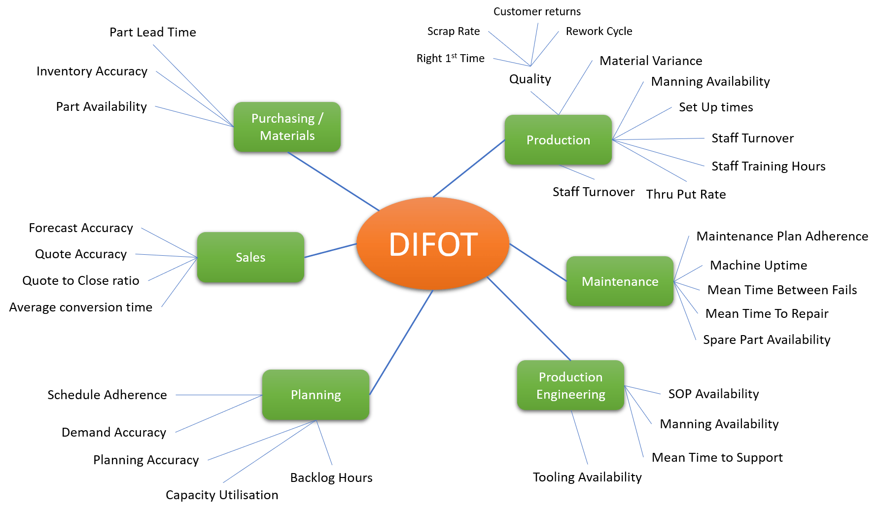 If you step back for a moment and think about everything that must go into achieving a 100% DIFOT measure it is quite impressive and every single team in the organisation is involved, not just your production team! The image below is just a snapshot of some of the measures that all must align in order to consistently achieve a perfect DIFOT.