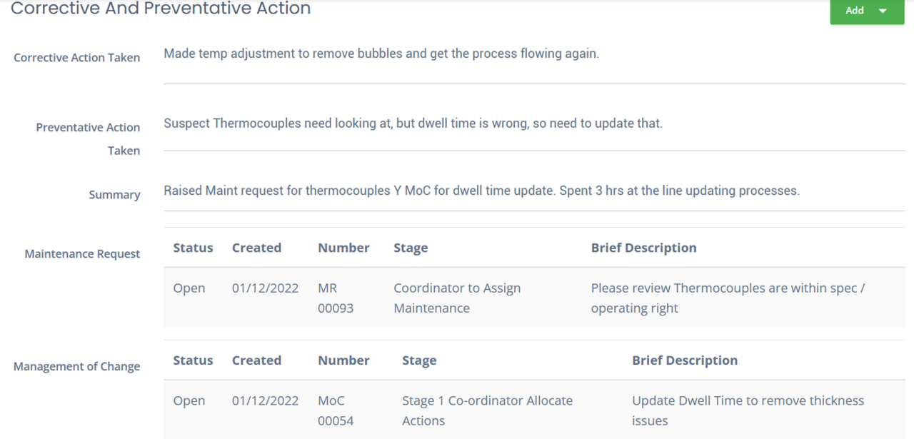Maybe you need to raise a maintenance request to have a part of your process maintained, or you need to update the documentation to add new process parameters or information. Being able to do all of these things and more directly inside your QA system means you have one single source of truth, and you can demonstrate to your team and auditors all the steps you have taken to solve this issue, because they are all linked and fully documented. That's where Mango's ability to raise and process the change request and link it directly to the improvement record makes life simple and allows you to reference all the documentation you need to change, the skills you need to update and the costs of doing it as well.
